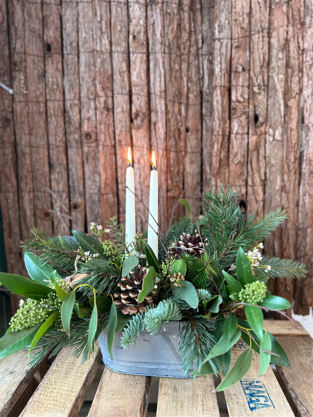 Rustic metal container filled with seasonal foliage, cones, dried fruit and candles.