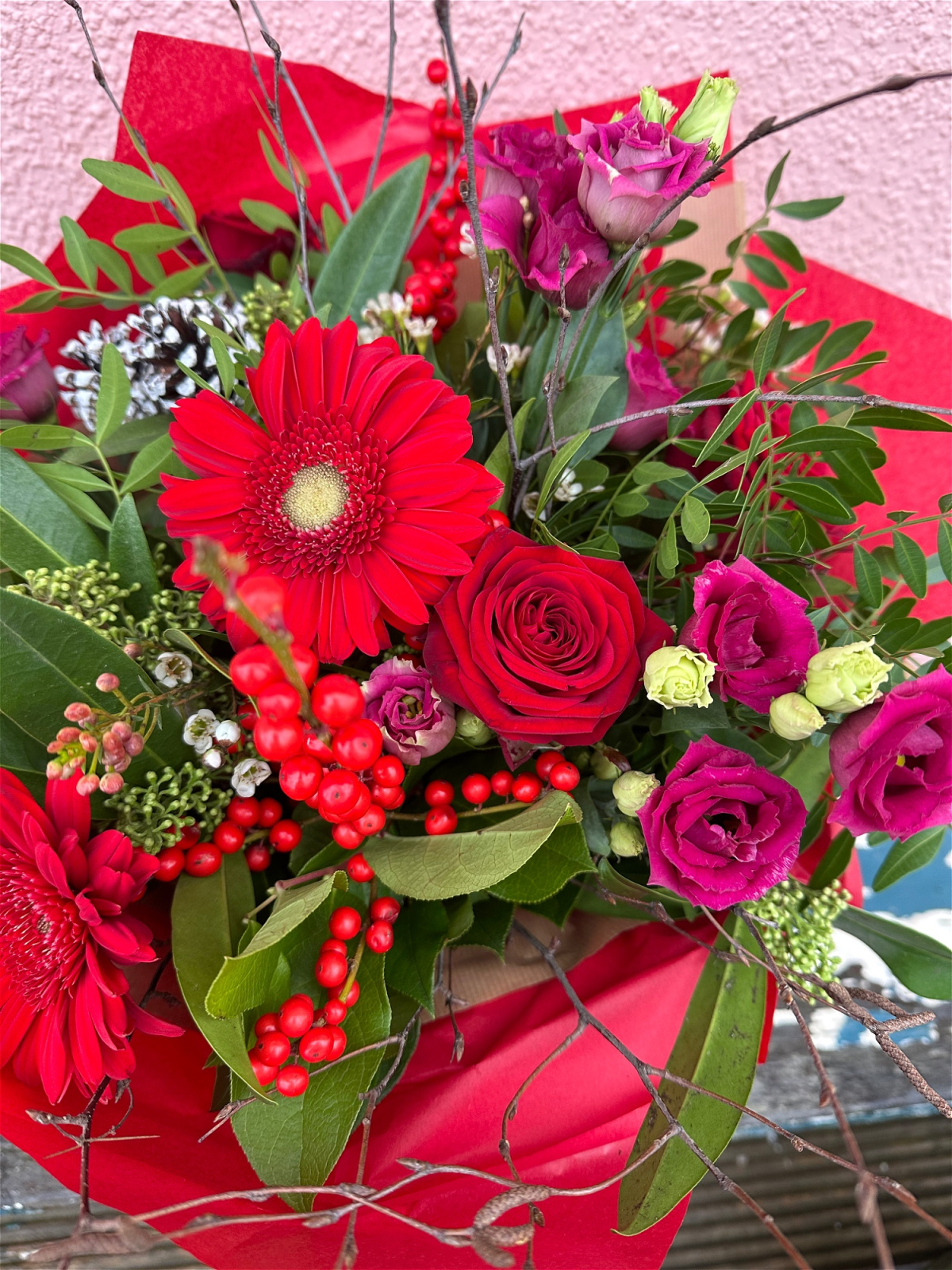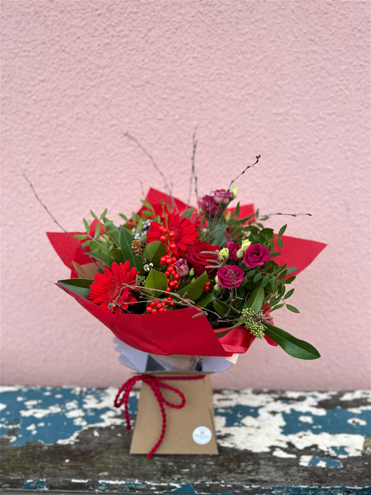 Hand tied bouquet in Festive reds and greens using the best of the seasons blooms. Gift wrapped and delivered in a bubble of water within a presentation box. Images show £55 size. Flowers will vary according to availability.